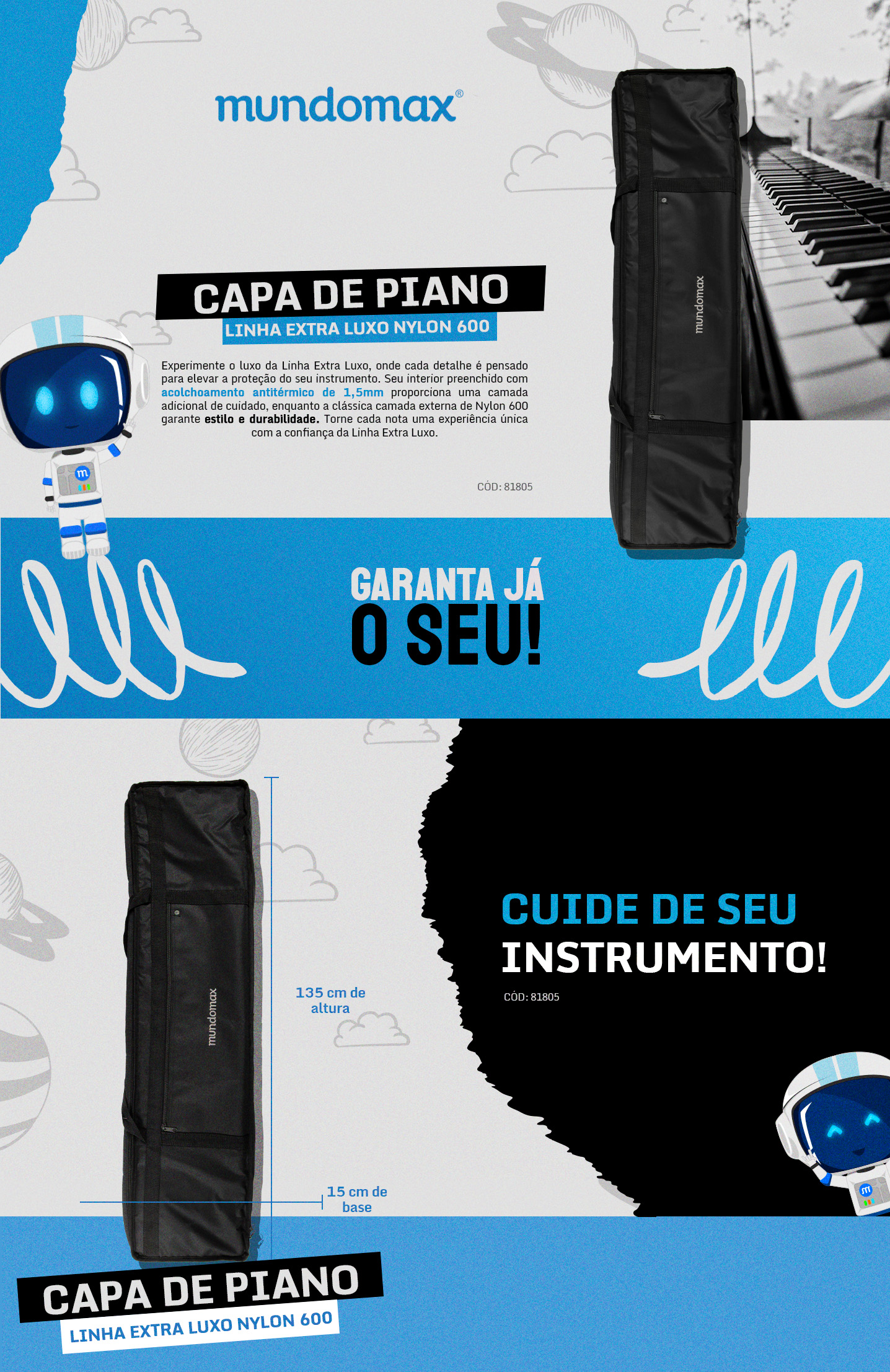 A Capa da Mundomax é uma solução elegante e segura de manter seu piano protegido enquanto o transporta. Sua camada externa durável é feita de Nylon 600, eficaz na proteção contra impactos, evitando rasgos. Seu interior é preenchido com acolchoamento antitérmico de 1,5mm que mantém seu piano protegido contra a variação de temperatura.
