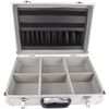 Corpo com estrutura em papelão prensado, envolvido por material protetor em PVC na cor cinza com alça PVC na cor preta, cantoneiras e detalhes em aço carbono cromado e forração em PVC cinza.