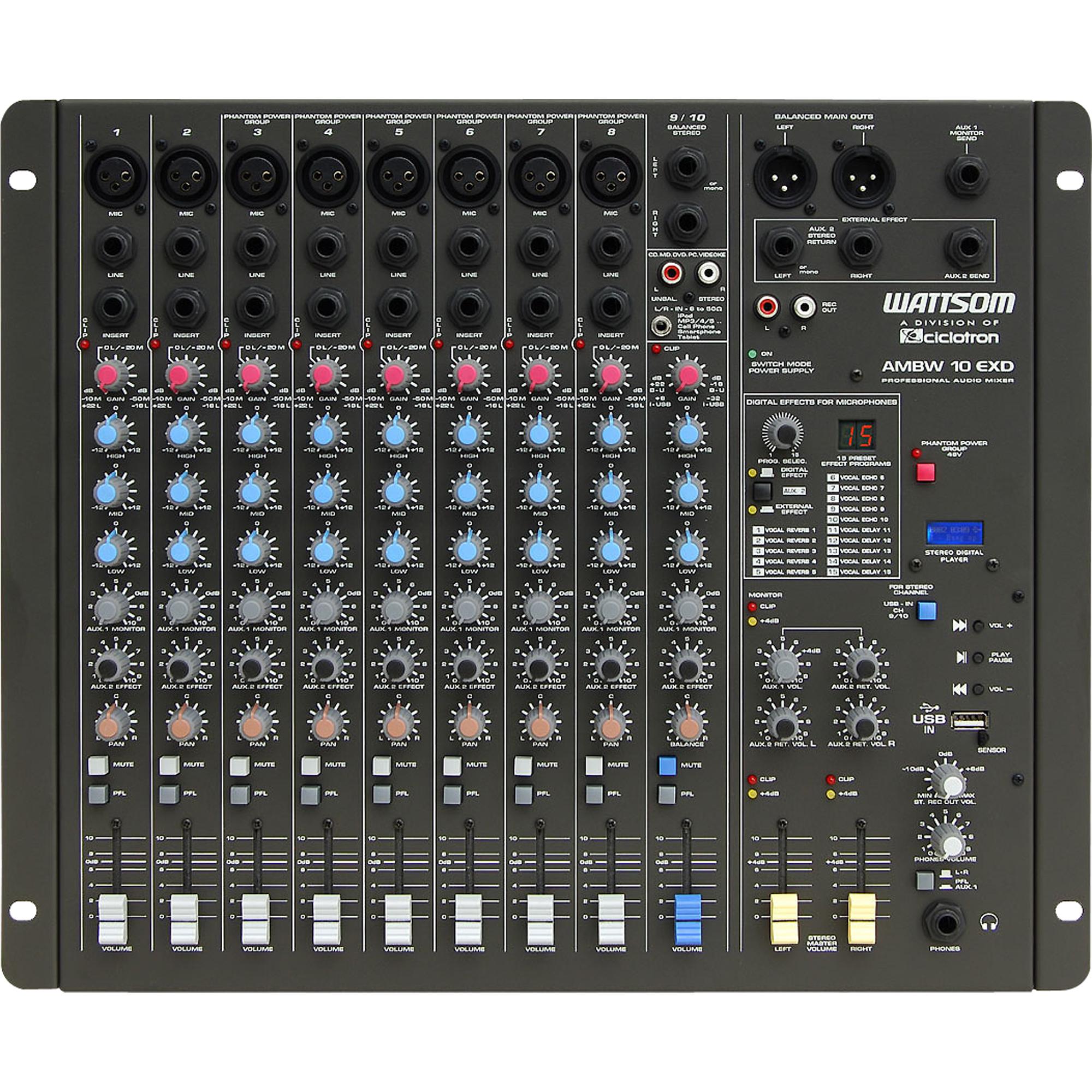 A Ciclotron apresenta a sua 5ª geração da linha de áudio mixer compacto e econômico AMBW 10 EXD, com entradas balanceadas e saída estéreo master balanceada flutuante, entrada USB - Estéreo Digital Player, com controle remoto, para pen drive ou para micro cartão SD ou SDHC através de adaptador USB, processador de efeitos digital com 15 pré-seleções de efeitos para microfones, Phantom Power Group e fonte de alimentação chaveada (fonte automática) de 90 a 260 Volts.