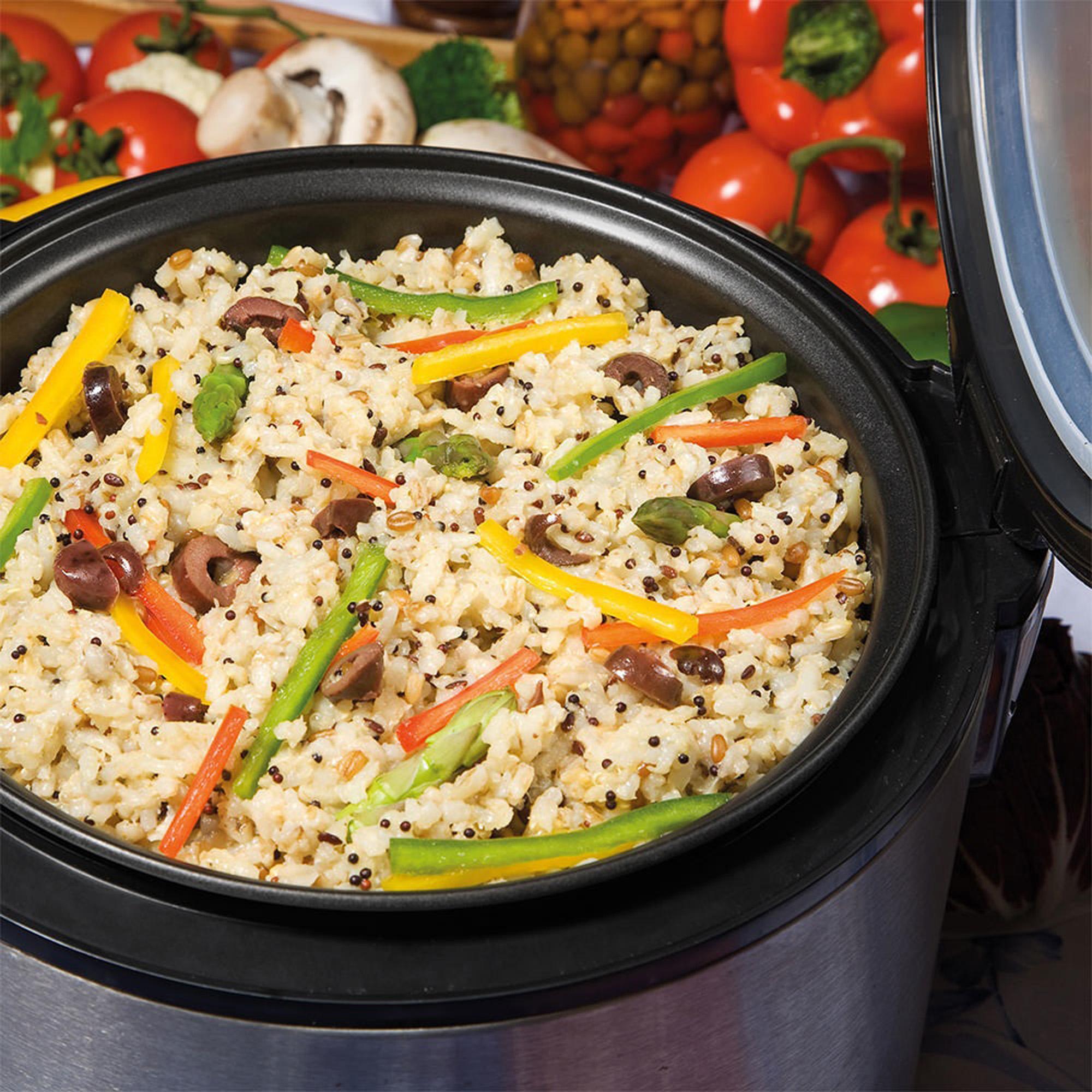 É automática e tem funcionamento extremamente simples, basta colocar os ingredientes e apertar um único botão para que o cozimento se inicie. Prepara simultaneamente arroz e legumes no vapor, consumindo menos energia.