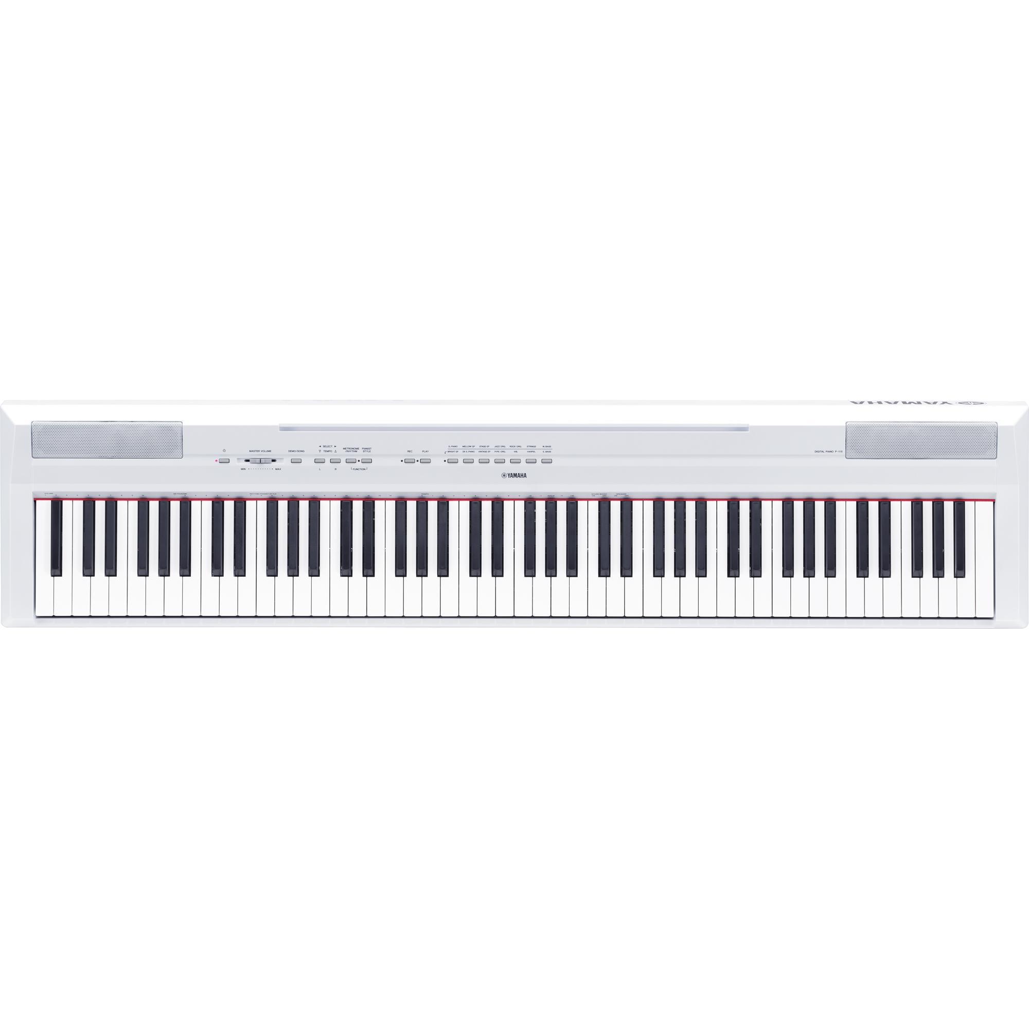 - Toque realista das teclas que oferece a sensação de tocar um piano real: P-115 apresenta um teclado GHS (Graded Hammer Standard). A sensação ao tocar o seu teclado altera-se gradualmente de acordo com o registo, para que o sinta mais pesado quando toca notas baixas e mais leve quando toca notas altas. O piano também apresenta um teclado realista ao toque, com teclas pretas de acabamento matizado, de forma a dar a sensação de estar a tocar um verdadeiro piano acústico.
